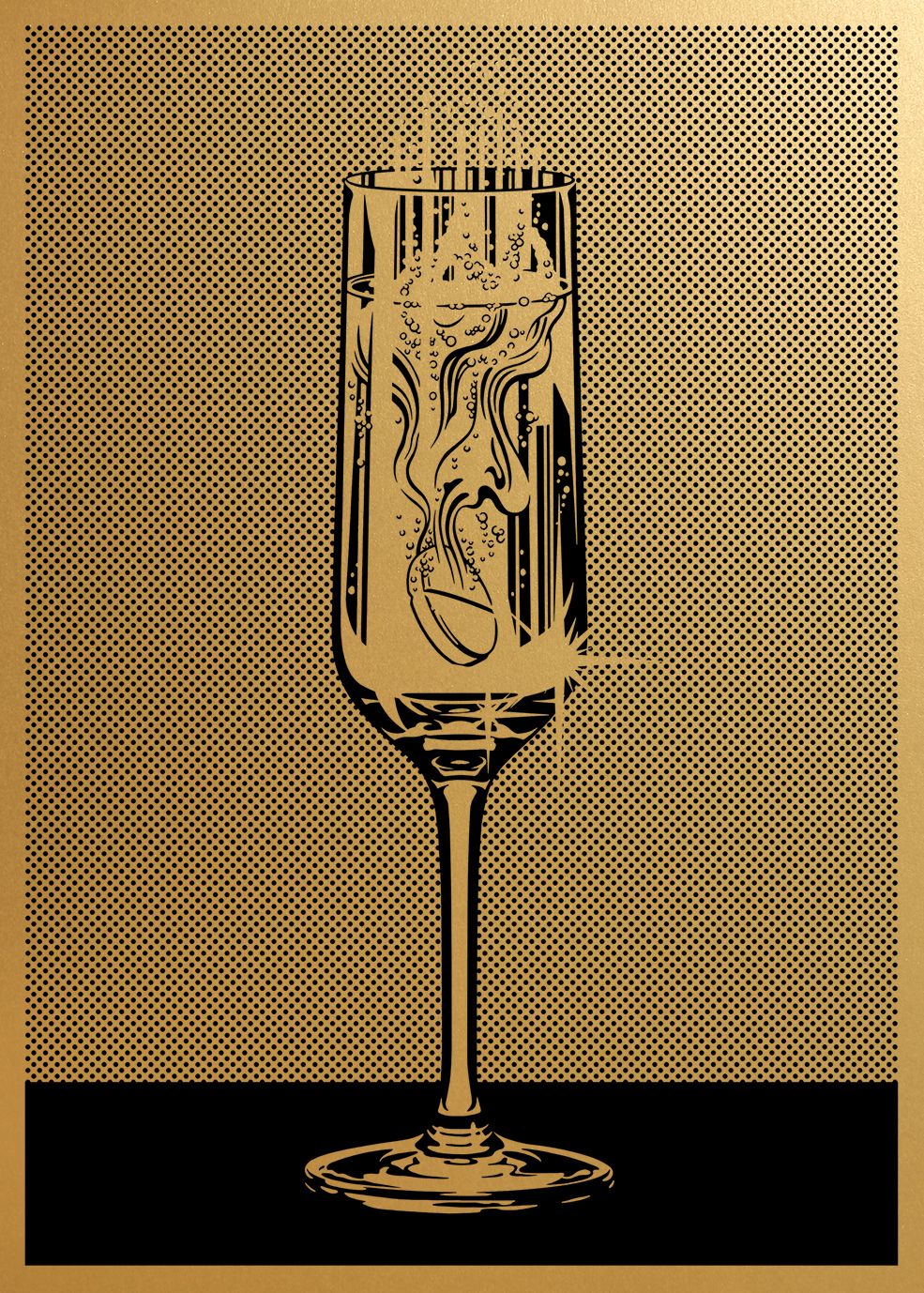 Screenprinted matt black on 230 gsm Sirio Pearl Aurum Gold paper.